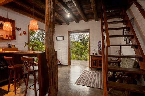 A cabana do Parque é do tamanho exato para um casal. Possui um banheiro completo, uma cozinha charmosa e equipada, integrada com a sala, além de varandas. Posicionada em meio a vegetação do cerrado, na borda de nosso platô, conta com visuais privilegiados para áreas do Parque Nacional, como a Cidade de Pedra e o Paredão do Eco, pontos turísticos que são um marco na paisagem de Chapada. Possui uma ducha imersa no jardim do cerrado, de uso exclusivo, e dois mirantes no piso superior, sendo um deles com deck e rede horizontal suspensa, posicionada para o nascer do sol, e o outro com uma banheira de hidromassagem aquecida, voltada para o pôr do sol. Ela acomoda 1 casal.